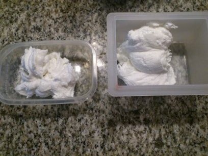 A hora vamos con el otro taper que teníamos reservado y le añadimos por lo menos una cucharada de postre entera de agua , si necesitamos más ya lo vamos viendo nosotros; tenemos que conseguir una textura semilíquida ; a mí me recuerda a la textura que conseguimos cuando removemos un yogur con la cuchara.